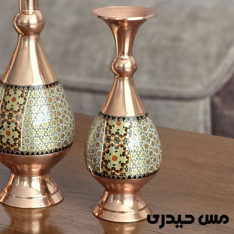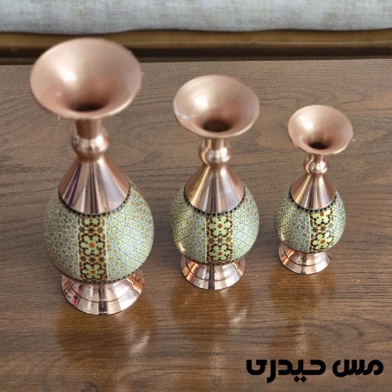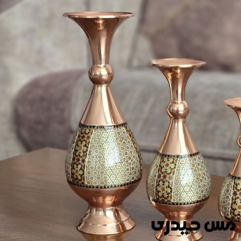 گلدان مسی خاتم کاری مدل شیپوری که در 3 سایز به دست مسگران اصفهانی با بهترین مواد نوع ورق مس و به زیباترین شکل طراحی و تولید و خاتم کاری شده است .